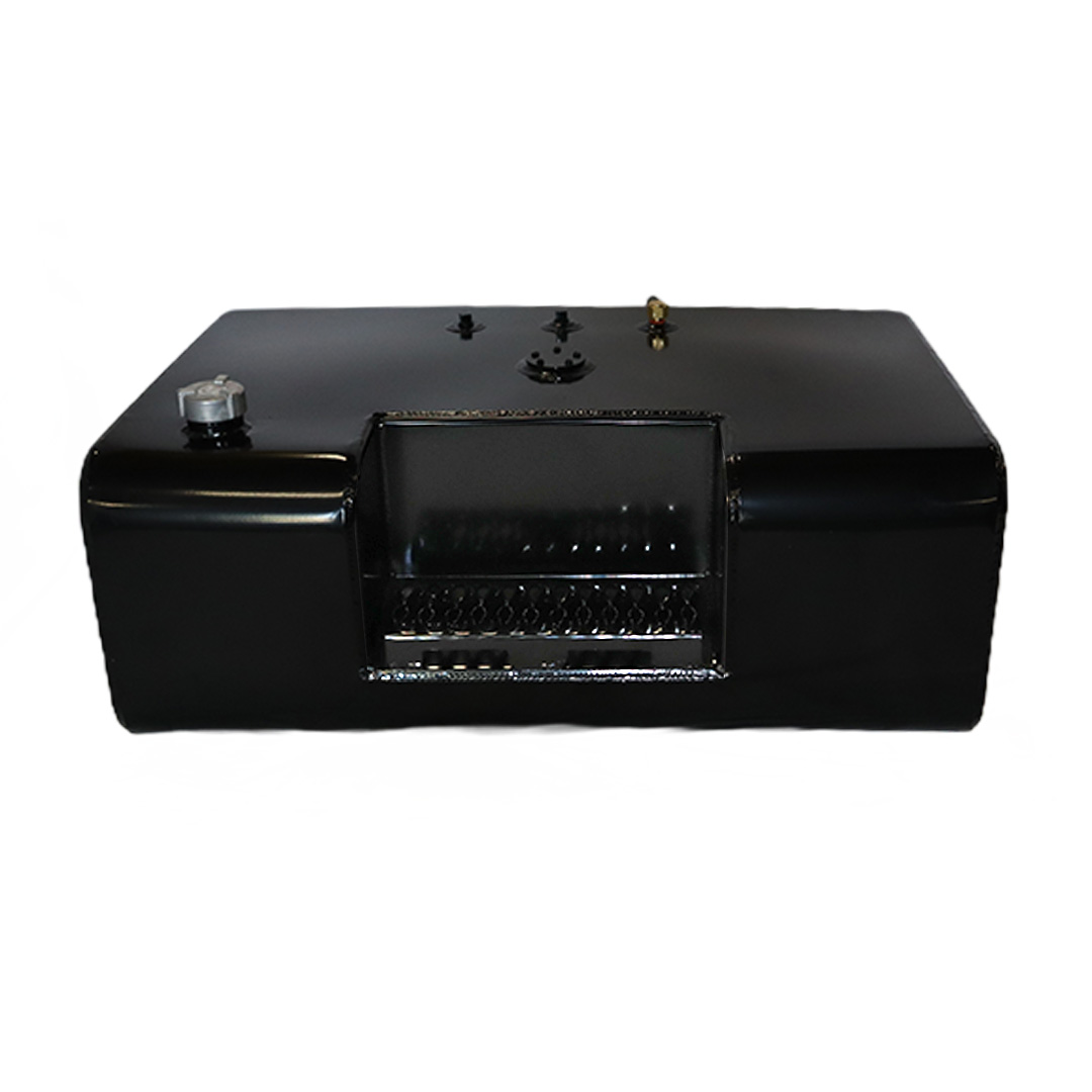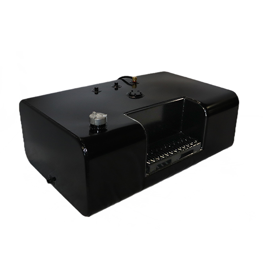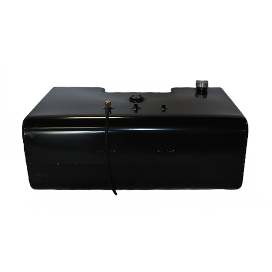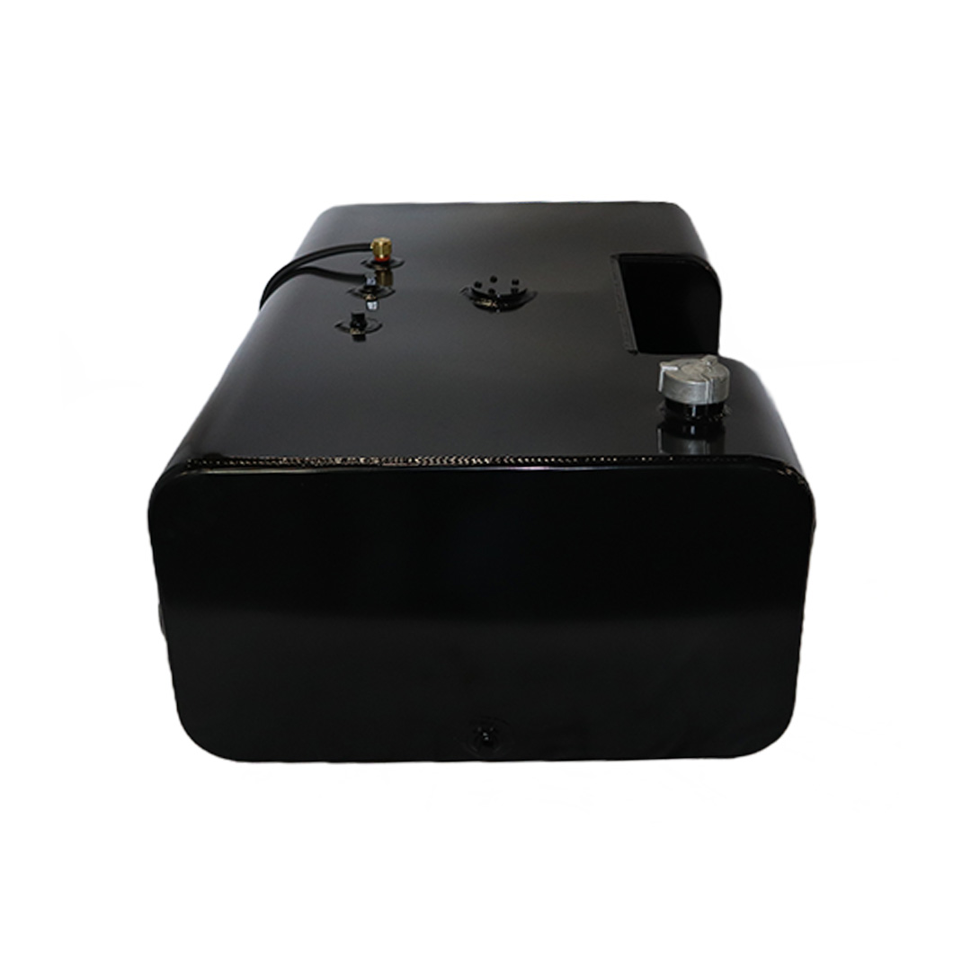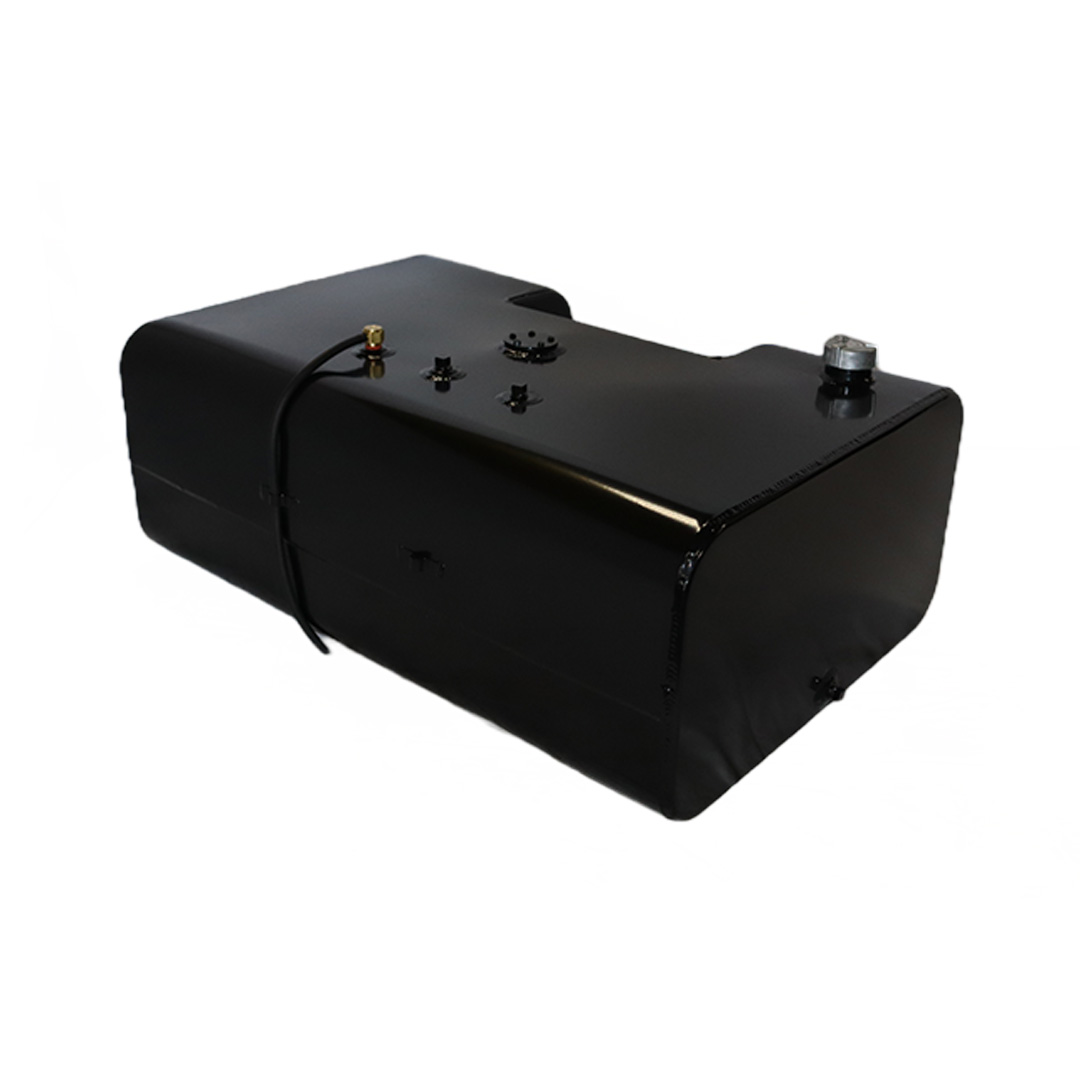 These aftermarket replacement steel diesel fuel tanks with built-in steps from Cleveland Tank are cost-effective alternatives to costly OE replacement tanks. Featuring a heavy-duty recessed steel step, these aftermarket fuel tanks are manufactured by hand from heavy-duty mild grade steel and for superior strength and durability. They come with a gloss black powder coat finish for years of long-lasting anti-corrosion protection, are pressure tested to ensure leak-free performance and have a rust preventive coating applied internally. The steel step tanks also come in various size capacities, are DOT-approved and are for use with diesel fuel. All steel fuel tanks with built-in steps come with a magnetic drain plug, rollover protection vent, vent tubing, fuel cap, drawtube, return, equalizer fittings and sending unit flange. Optional features include a sending unit, sight gauge, locking fuel cap and drain check valve. Find the rectangular steel step fuel tank that matches your applications specs for an original equipment-like fit and installation. This specific steel rectangular-shaped tank with built-in step has a capacity of 50 gallons, weighs 125 lbs. and measures 38.50 in. long by 25.50 in. wide by 14.00 in. high.